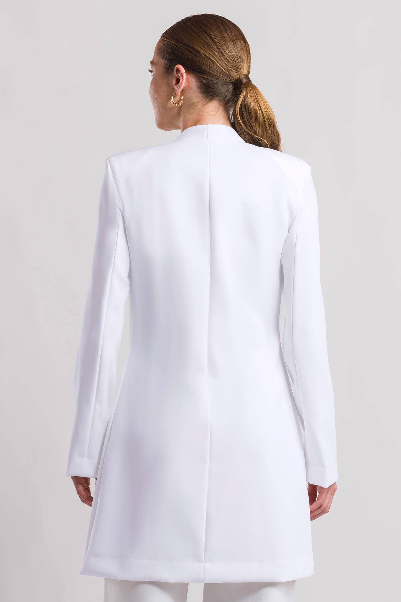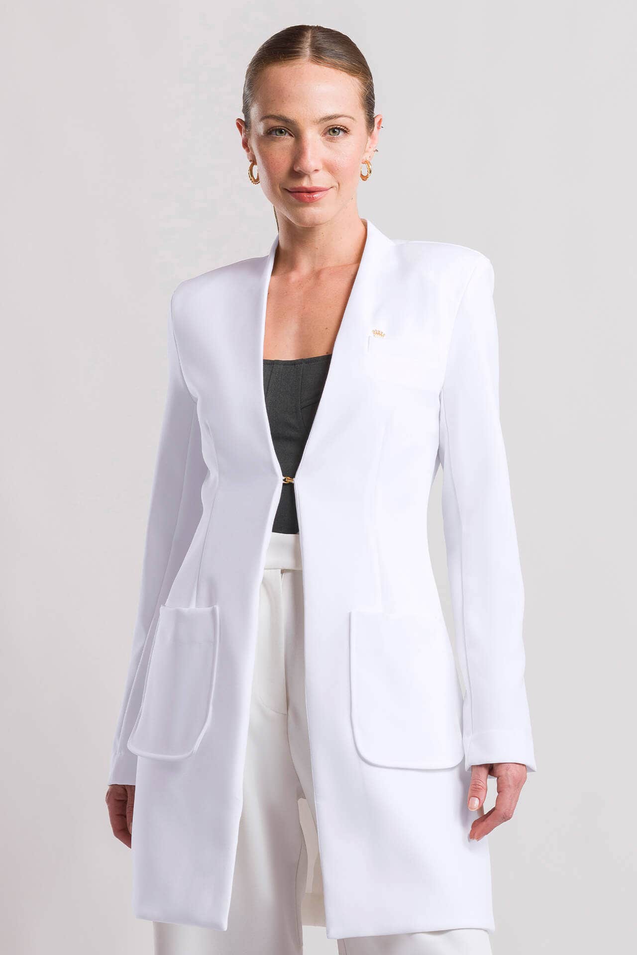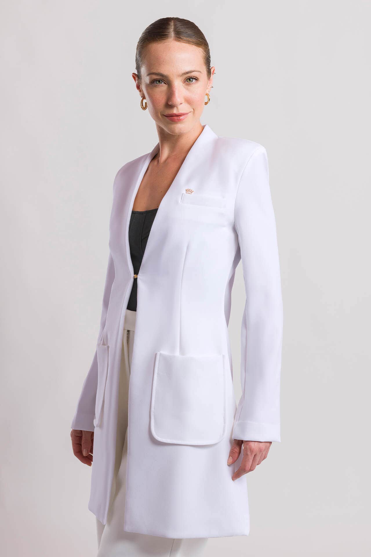 O Jaleco Feminino Laura é a peça que equilibra luxo, funcionalidade e design contemporâneo. Confeccionado em tecido premium estruturado com 95% poliéster e 5% elastano.